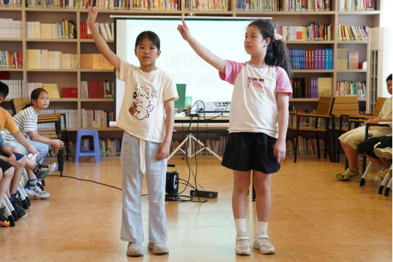 突击队队员吴嘉欣、陈慧敏带领员工继续学习学习《春日郊游》中的经典粤剧动作。课程进入“整合念白与动作”环节,队员们以《春日郊游》的唱段为引,引导孩子们在念白时配合“望”“指”“转身”等动作,让声音与肢体同频共振。下午,戏曲课聚焦“提升表演协作能力”,将念白、动作与节奏融为一体。孩子们分组排练,课堂瞬间化身“小梨园”。