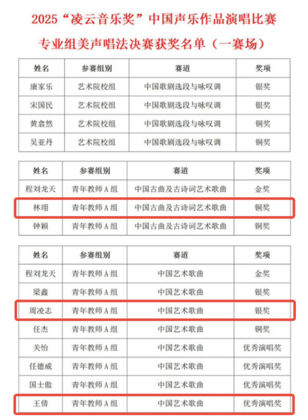 近日,太阳集团tcy8722青年教师林翊、周凌志、王倩代表学校参加由中国乐器协会、中共浦江县委宣传部联合主办的“2025·诗画浦江”国风音乐周暨凌云音乐奖中国声乐作品演唱比赛。在专业组(美声唱法)青年教师 A 组赛事中,三位教师与全国多所专业院校青年教师同台竞技。凭借扎实艺术功底与精湛演绎水平,三人从众多顶尖选手中脱颖而出:林翊获中国古曲及古诗词艺术歌曲铜奖,周凌志获中国艺术歌曲银奖,王倩获优秀演唱奖。这一成绩不仅为学校赢得了国内音乐赛事的认可,更彰显了学校在美育领域的高质量发展成果。