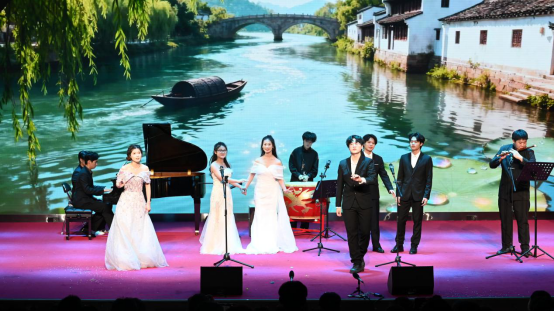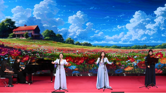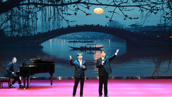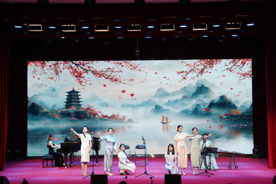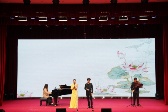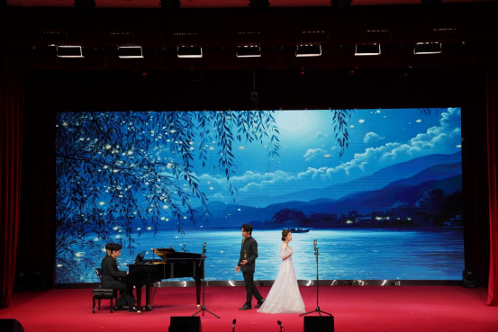 音乐会在器乐合奏《春和景明》中正式拉开帷幕,以明快流畅的旋律勾勒出春日生机盎然的画卷,细腻的器乐配合迅速将观众带入清新雅致的艺术意境,为整场演出奠定了灵动鲜活的基调。紧随其后的舞台剧《客家山歌缘》带来了浓郁的地域文化气息。男女二重唱《灿若星辰的目光》,将青春的炽热与对未来的憧憬娓娓道来,真挚的情感引发在场学子的强烈共鸣;萨克斯二重奏《天堂电影院》以萨克斯独特的叙事性音色,带领观众重温电影中的梦想与成长故事。女声三重唱《黄鹤楼》更具匠心,将"黄鹤楼"的千古风华诠释得淋漓尽致。男声二重唱《那一晚》,以柔美的声线将观众带入到美好的月圆夜晚。多元艺术形式的碰撞让音乐会氛围持续升温,阿卡贝拉《TRY EVERYTHING》,以无伴奏的纯人声演绎展现了精准的和声把控力,充满活力的节奏瞬间点燃现场气氛。音乐剧《妈妈咪啊》用富有张力的表演和欢快的旋律,再现了经典音乐剧的活力与激情;男女二重唱《爱莲说》,以清新雅致的曲风传递出莲花的高洁品质。音乐剧弹唱《歌剧魅影》则风格迥异,钢琴与演唱的巧妙结合,将作品的神秘与浪漫诠释得恰到好处,让观众沉浸在经典艺术的魅力之中。女声二重唱《花儿为什么这样红》创新融入非洲鼓与小提琴的伴奏,为经典民歌注入全新活力。舞台剧《夜上海》生动再现了老上海的繁华风情,带领观众重温旧时光韵。民歌串烧《水韵组曲》串联起多种民歌风格,尽显民族音乐的丰富多样性;男女二重唱《小篷又泛曾行路》旋律悠扬间铺陈出悠远意境。最后,以舞台剧《COME ALIVE》动感十足的表演收官,为整场音乐会画上圆满句号。